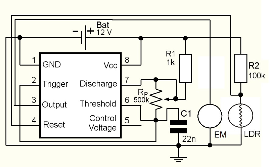 - 1. The circuit is made on the basis of an astable operation. ‘’Light sensitive circuit (1).jpg’’. The only changes are that the second connected resistor in series from the astable circuit (coming from the 7th chip leg/ discharge) is replaced by a potentiometer and that the chip reset/ acceptance and the output/ exit are brought to the components which cause a specific operation.