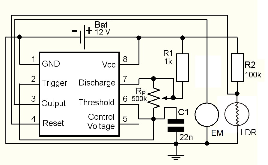 - 2. From the positive pole the resistor (R2) is brought to the reset and the path continues to the light-dependent resistor which is earthed on the other side. The light-dependent resistor controls the conditions in the room.