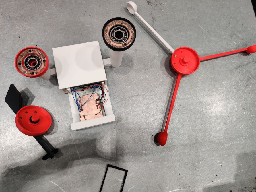 - Direction sensor: IR-receptors react to the 3D-printed top part’s reflected light. There is a IR-Led and a IR-transistor in the sensor. 30-40 cm long wires are soldered to the circuit board. Sensor’s circuit board and bearing are placed in the 3D-printed lower part. Upper part is non-reflective material and a 140 ° wide surface is fixed to it. The 3D-printed direction arrow is attached to the upper part. Lower part is connected to the Arduino Uno’s case via 3D-printed pipe.