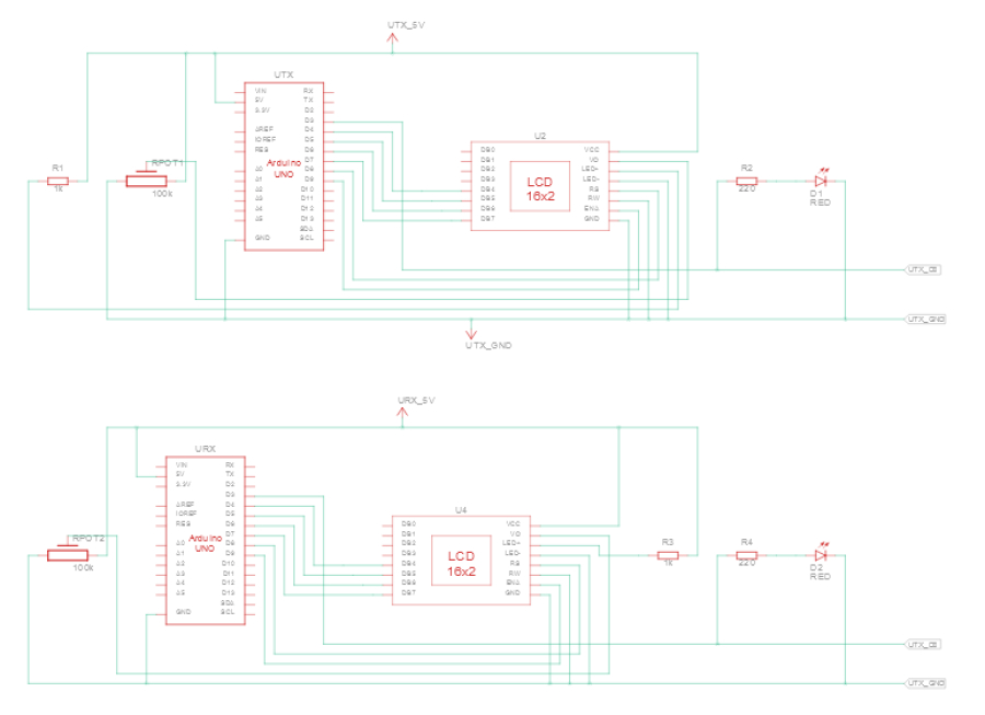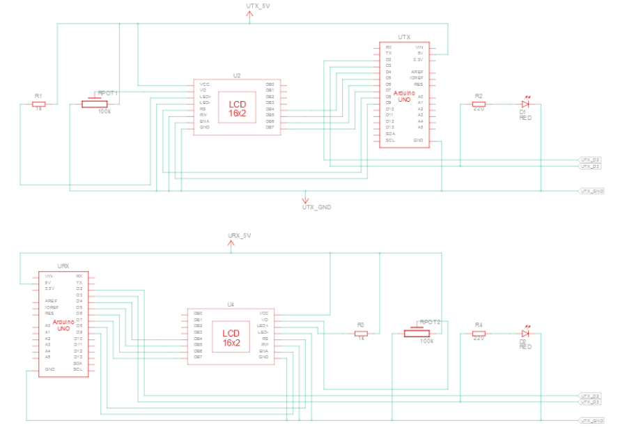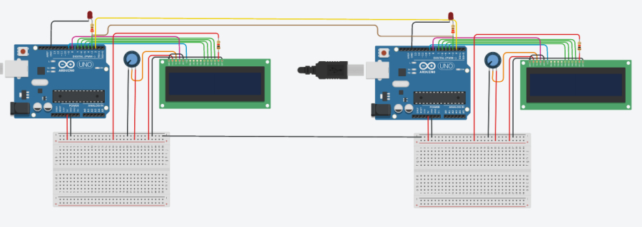 At this point you have only built the transmitter, but to actually transmit something, you need to build a receiver. The circuit for this is just an exact copy of the transmitter. The new thing that needs to be added to the circuit is the communication cables. One cable will be for the transmission the other one will be connected to ground between the Arduino’s.
