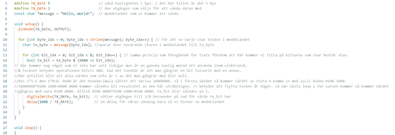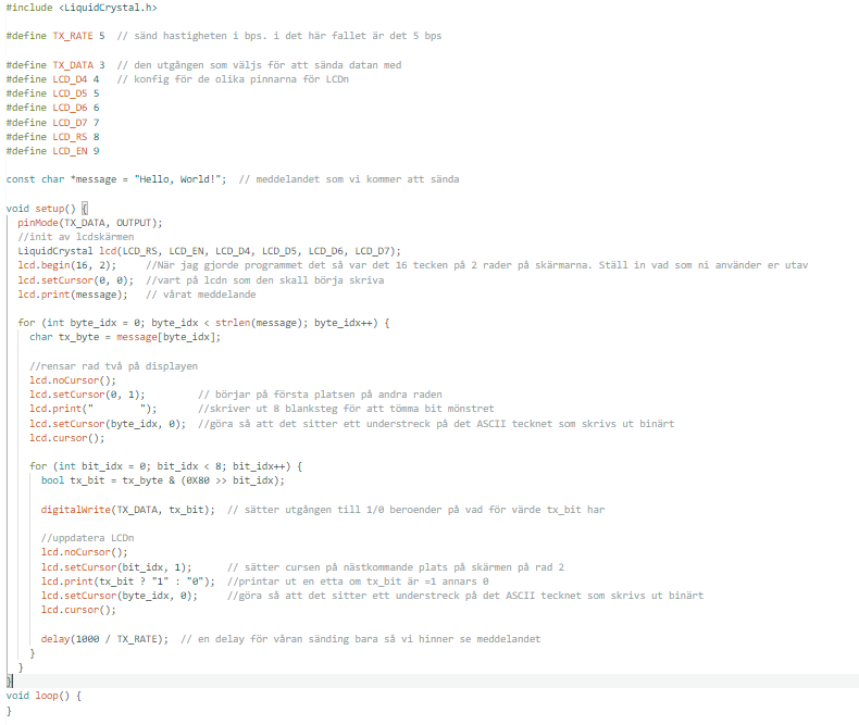 When you have done that, you need to write the code. The code will in this stage only be for the transmitter. You will find the code in TX_LED code. The program will now work in such a way that every time the signal is high the LED will light up and when its low it will turn off. The combination of high and low will be dependent of what character you are sending. This is done by the computer using something that is called an ASCII table. In this table all English characters are represented. The message you will send is “Hello, world!” And if you look in the ASCII table, see ASCII table you will see that capital H will correspond to the binary sequence of 01001000.