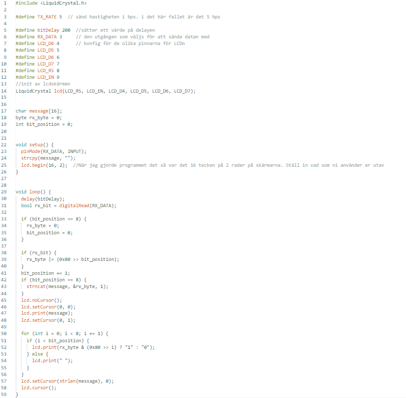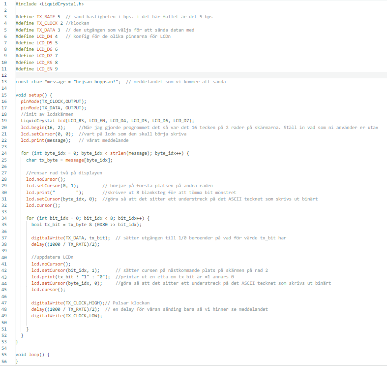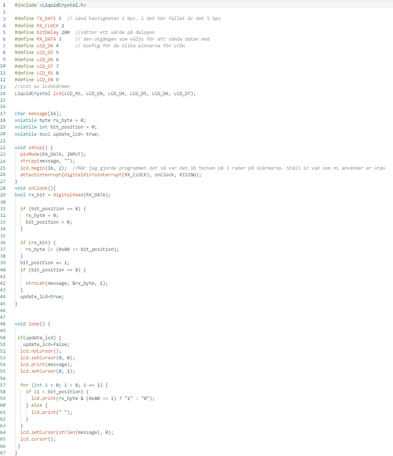 Digital communication refers to the transmission of data, information, and messages through digital devices and channels. With the increasing reliance on technology and the Internet, digital communication has become a crucial aspect of modern society. In order for this to work a common framework is needed. In this laboration you will set up a basic communication protocoll between two Arduinos.